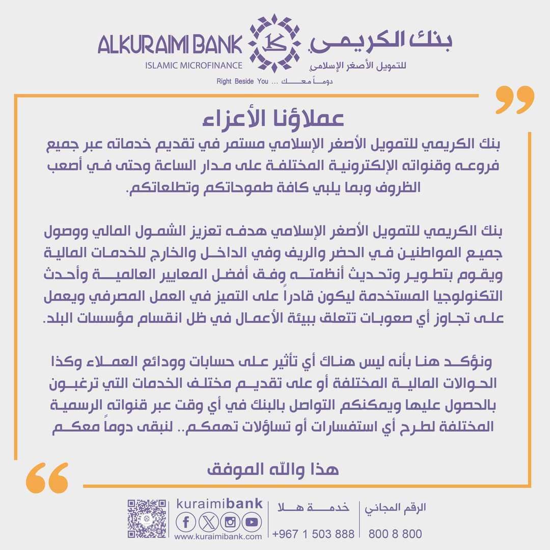 #بنك_الكريمي للتمويل الأصغر الإسلامي يعلن تقديم خدماته عبر جميع فروعه وقنواته الإلكترونية على مدار الساعة