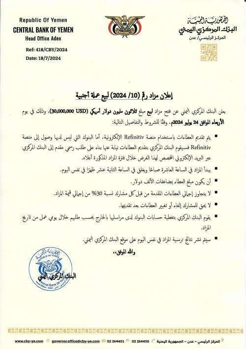 اعلن البنك المركزي اليمني عدن عن فتح مزاد لبيع مبلغ ثلاثون مليون دولار أمريكي (30,000,000 USD).