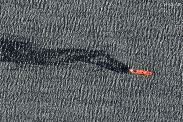 وأوضح المرصد في منشور على منصة "إكس" أن البقعة الظاهرة والتي تمتدّ على 220 كلم، تشير إلى أن "السفينة المتضررة تسرّب النفط".