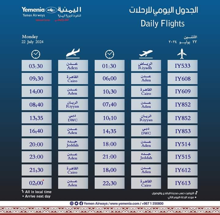 حفظ الصورة مواعيد رحلات طيران اليمنية الإثنين 22 يوليو 2024 الإثنين ٢٢ يوليو ٢٠٢٤ الساعة ١٢:٤٣ صباحاً عدن/ مجال نت