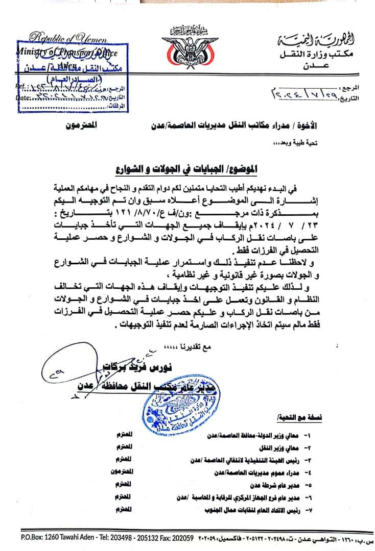 وتأتي هذه المذكرة الثانية التي يوجه فيها مدير عام مكتب النقل بالعاصمة عدن ، بإيقاف الجبايات الغير قانونية في الجولات والشوارع بعدن .