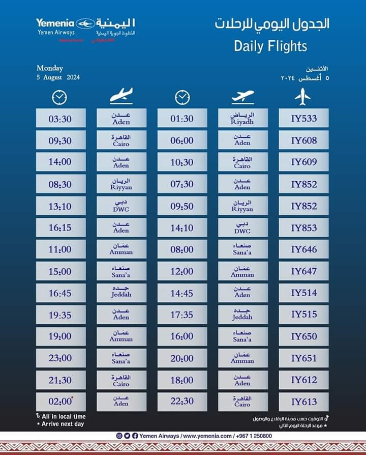 حفظ الصورة مواعيد رحلات طيران اليمنية ليوم غد الإثنين 5 أغسطس 2024 الأحد ٠٤ أغسطس ٢٠٢٤ الساعة ٠٤:٤٧ مساءً عدن/ مجال نت
