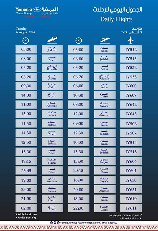 حفظ الصورة مواعيد رحلات طيران اليمنية ليوم غد الثلاثاء 6 أغسطس 2024 الثلاثاء ٠٦ أغسطس ٢٠٢٤ الساعة ١٢:٠٨ صباحاً عدن/ مجال نت