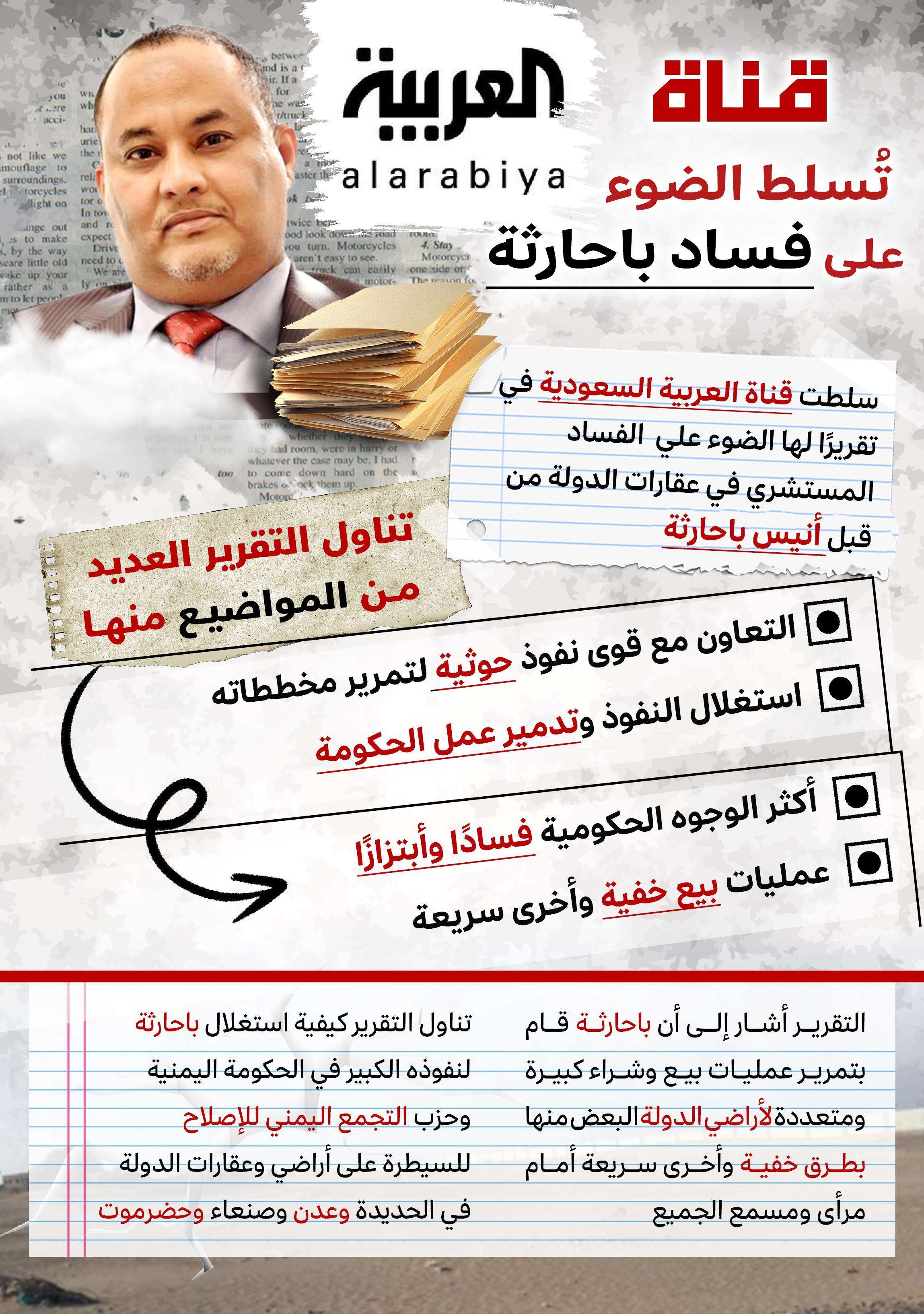 سلطت قناة العربية السعودية في تقريرًا لها نُشر على نطاق واسع على الصعيدين المحلي والخارجي حول الفساد المستشري في عقارات الدولة من قبل أنيس بن عوض باحارثة الذي يشغلُ حاليًا وظيفتين حكوميتين مزدوجتين وهما مدير مكتب رئيس الوزراء، ورئيس الهيئة العامة للأراضي والمساحة والتخطيط العمراني في طريقة مخالفة لأنظمة ولوائح القانون اليمني.
