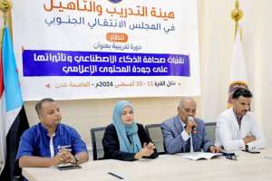 دشنت هيئة التدريب والتأهيل المساعدة لهيئة رئاسة المجلس الانتقالي الجنوبي، اليوم الأحد، دورة تدريبية بعنوان "تقنيات صحافة الذكاء الاصطناعي وتأثيراتها على جودة المحتوى الإعلامي".