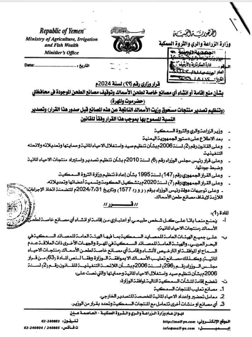 ووجة معالي الوزير السقطري، القرار للتنفيد الى المعنيين بالأمر، رؤساء الهيئة العامة للمصائد السمكية في، خليج عدن، والبحر الأحمر، والبحر العربي، والمهرة، بأيقاف العمل في المصانع الموجوة حاليآ، وكذا الجديدة، ومنع منح تراخيص أنشاء مصانع أخرئ لطحن الأسماك، أو أية تصاريح مزاولة لها، الا بعد أخد الموافقه من وزارة الزراعة والري والثروة السمكية، باعتبارها الجهة المعنية بالامر.
