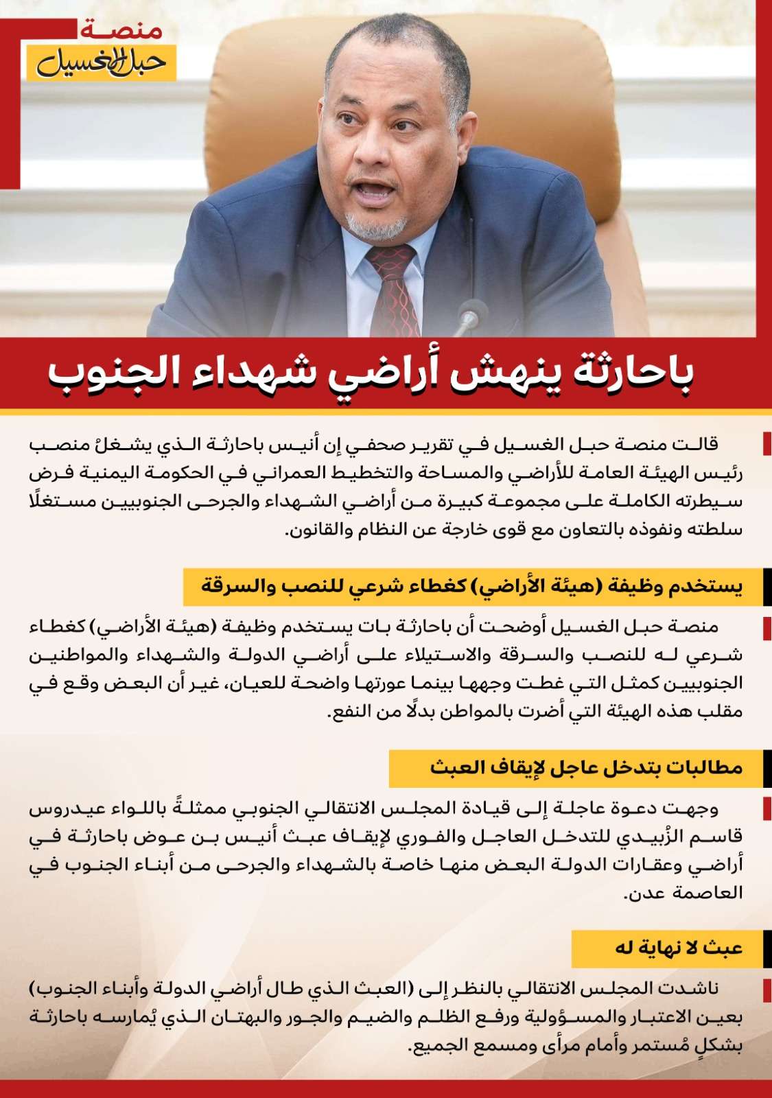 وقالت منصة حبل الغسيل في تقرير صحفي إن أنيس باحارثة الذي يشغلُ منصب رئيس الهيئة العامة للأراضي والمساحة والتخطيط العمراني في الحكومة اليمنية فرض سيطرته الكاملة على مجموعة كبيرة من أراضي الشهداء والجرحى الجنوبيين مستغلًا سلطته ونفوذه بالتعاون مع قوى خارجة عن النظام والقانون.