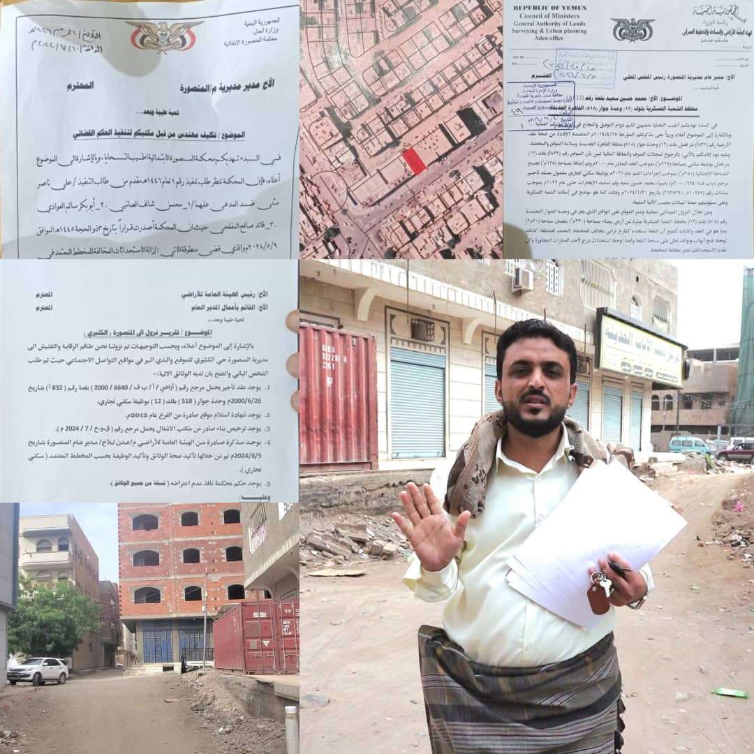 ناشد المواطن رشاد عبدالقوي اليوم سلطات العاصمة عدن، ووحدة حماية الأراضي بقيادة المقدم كمال الحالمي تمكينه وحمايته لبناء قطعة ارضه الكائنة في شارع الكثيري بلوك 12 القاهرة، الواقعة بين عمارتين، مؤكدا امتلاكه كافة الوثائق والاحكام القضائية، التي تثبت ملكيته لقطعة الأرض المرقمة بـ 832A، بلوك 12 وحدة جوار 518 مساحتها 350م، سكني تجاري.