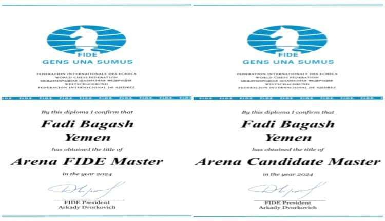 حصد اللاعب الدولي للشطرنج فادي بجاش من محافظة لحج على لقبين جديدين دوليين، لقب مرشح استاذ من الإتحاد الدولي للشطرنج وايضاً لقب استاذ اتحادي.