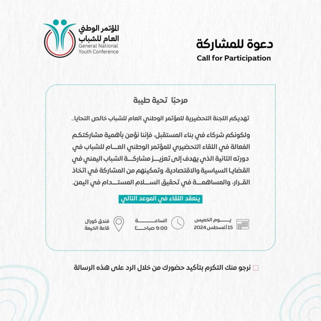 لقد انعقدت اللقاءات التعريفية بالمؤتمر الوطني العام للشباب في كل من محافظات حضرموت وتعز ومأرب وسط تفاعل شبابي كبير وحضور محلي ورسمي واسع وداعم للعمل المدني والفعاليات الشبابية والمدنية، إلا أننا تفاجأنا من منع إقامة الفعالية في مدينة عدن التي عُرفت تاريخيًا بأنها واجهة للعمل المدني وملاذا أمانا لاستضافة الفعاليات الثقافية والاجتماعية.