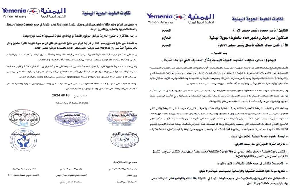 وجددت النقابات دعوة "كافة المعنيين في قيادة الشركة للجلوس معا على طاولة الحوار في العاصمة الأردنية عمّان خلال الأسبوع القادم للنظر في التحديات التي تعصف بالشركة وفقا لما تضمنته هذه المبادرة وكذلك مبادرة نقابات اليمنية بتاريخ 2023/10/3 ،وما تضمنه بيان المبعوث الأممي بتاريخ 2024/7/23 وذلك للخروج بحلول توافقية".
