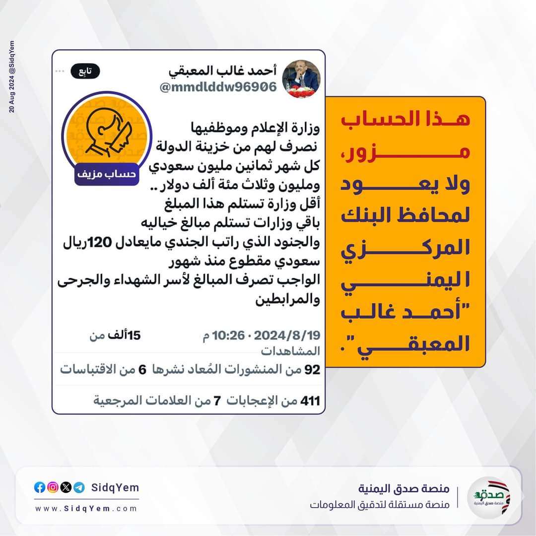 حذر مصدر مقرب من محاف البن المركز من حسابات مزورة تنتحل اسم وصفة محافظ البنك المركزي اليمني، أحمد المعبقي. إذا صادفتم أي حساب يدعي أنه يمثله أو يتحدث باسمه، نرجو منكم عدم التفاعل معه والإبلاغ عنه فورًا.