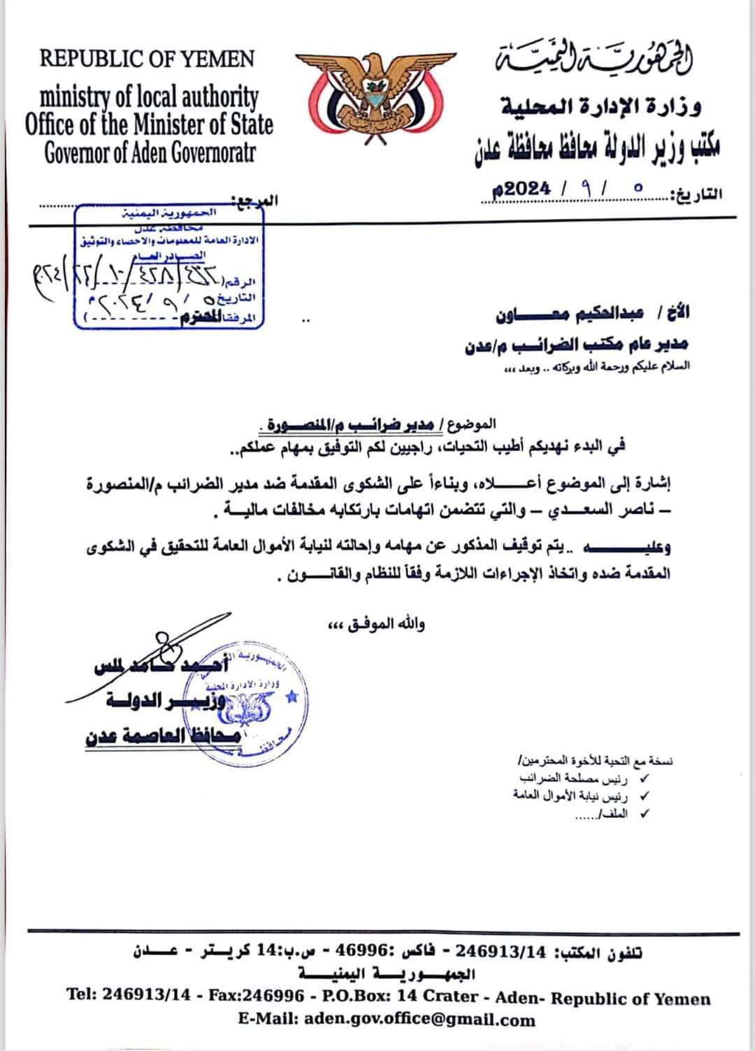 حصل محرر مجال نت على مذكرة من محافظ عدن احمد حامد لملس، اليوم، بايقاف مدير ضرائب مديرية المنصورة ناصر السعدي واحالته إلى نيابة الأموال العامة، على خلفية شكوى موثقة بالفيديو ضده وسمسرته بنسبة الضرائب.