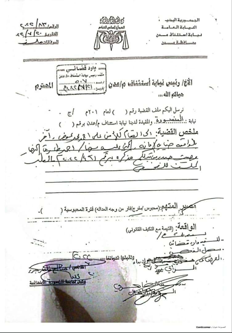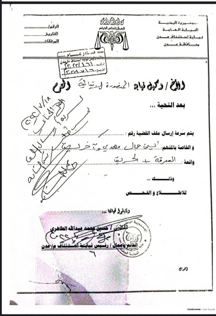 وأوضحت مذكرة رأي في القضية الجنائية رقم (6) لسنة 2022م غير جسيم لدى نيابة المنصورة والمقيدة برقم (16) بسجل الفحص لدى نيابة استئناف عدن، والصادرة عن عضو نيابة استئناف عدن، فوزية سلام محمد، التي كشفت في ملخصٍ لها عن وقائع القضية بحسب ما جاء في استدلالات الشرطة ومحاضر تحقيق النيابة العامة؛ أوضحت بتورط المتهم علي أحمد محمد الشيباني بسحب بضاعة بقيمة عشرات الملايين كانت تُدفع لأشخاص ومنهم "أنيس باحارثة" مقابل تقديمه تسهيلات لاستخراج الجنسية اليمنية لمواطنين سوريين.