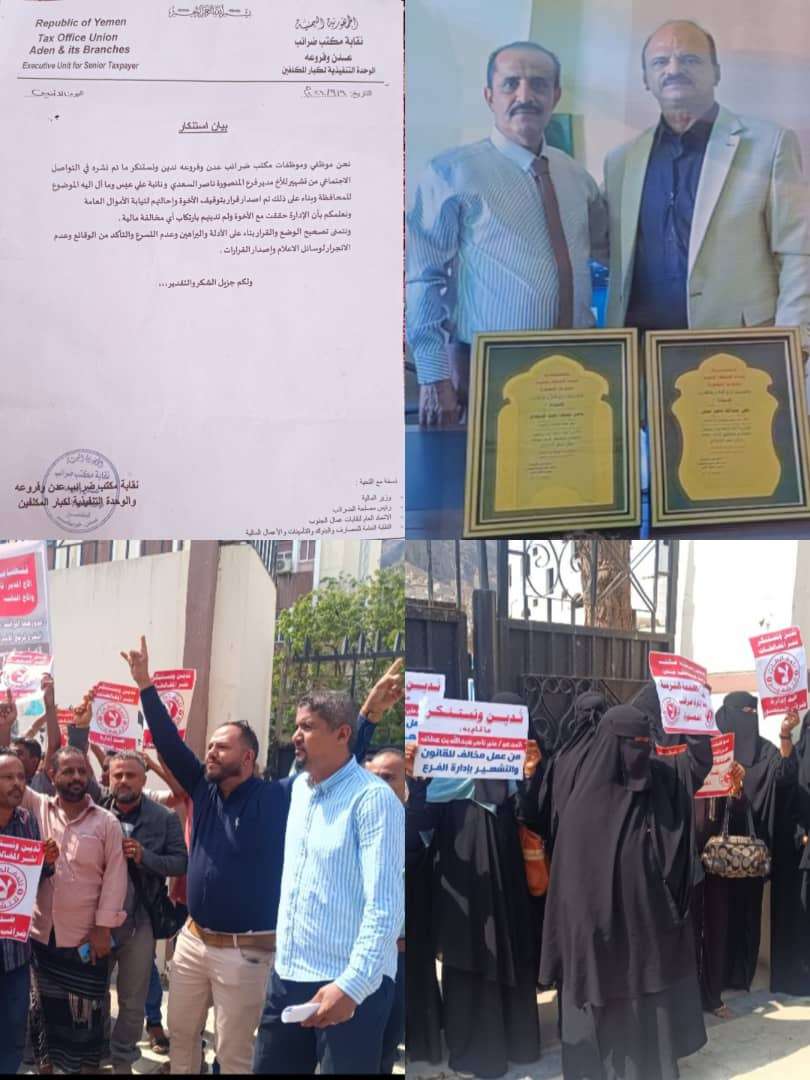 نحن موظفي وموظفات مكتب ضرائب عدن وفروعه ندين ونستنكر ما تم نشره في التواصل الاجتماعي من تشير لمدير فرع المنصورة الاخ / ناصر السعدي ونائبه الاخ/ علي عبس وما ال اليه الموضوع للمحافظة.