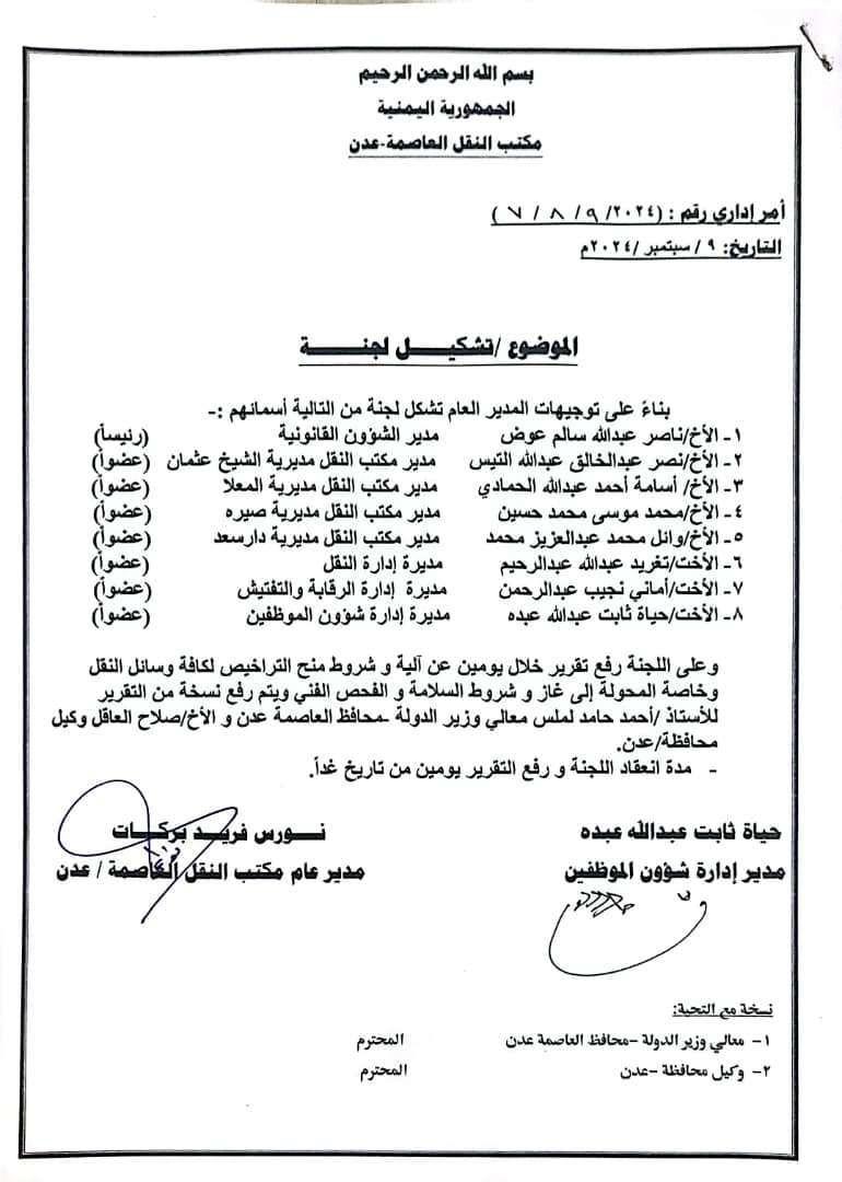 كلف مدير عام مكتب النقل بالعاصمة عدن نورس فريد بركات ، لجنة من مدراء إدارات الشؤون القانونية - النقل - الرقابة والتفتيش - شؤون الموظفين ومدراء مكاتب النقل في الشيخ عثمان - المعلا - صيره - دار سعد ، لرفع تقرير عن آلية منح التراخيص والسلامة والفحص الفني لوسائل النقل وخاصة المحولة إلى الغاز .