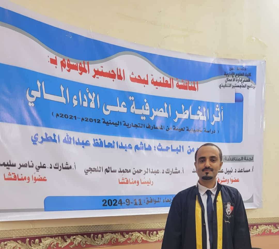 نال الباحث هاشم عبدالحافظ عبدالله المطري يوم الاربعاء الموافق 11 سبتمبر ٢٠٢٤م ، رسالة الماجستير بامتياز من كلية العلوم الادارية بجامعة عدن حول رسالته الموسومة ب أثر المخاطر المصرفية على الأداء المالي لعينة من المصارف التجارية اليمنية . وقد اشادت اللجنة المكونة من أ. مشارك د. عبد الرحمن محمد سالم اللحجي رئيساً ومناقشاً وأ. مشارك د. علي ناصر الزامكي عضواً ومناقشاً وأ. مساعد د. نبيل عثمان سالم عضواً ومشرفاً علمياً بالرسالة التي قدمها الباحث و نال على اثرها درجة الماجستير بامتياز.
