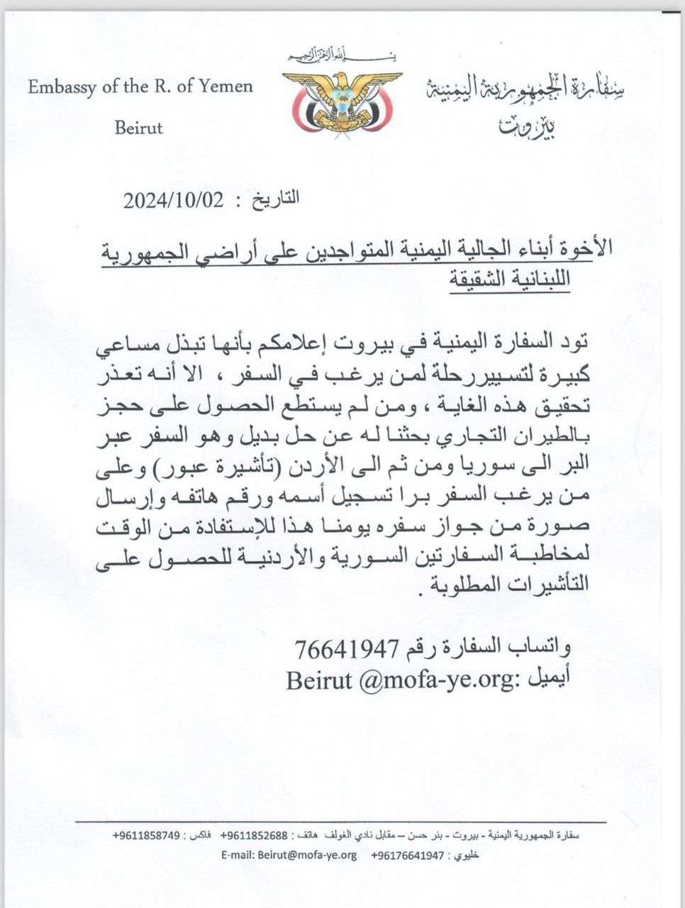 اكدت السفارة اليمنية في بيروت لرعاياها الراغبين في مغادرة #لبنان أن السفر براً هو الخيار المتاح حالياً لمن لم يحصل على حجز طيران وتعذر محاولاتها لتسيير رحلة جوية .