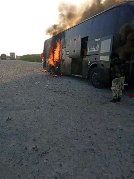 شاهد بالصور.. احتراق ‘‘باص’’ نقل جماعي بالكامل في أبين