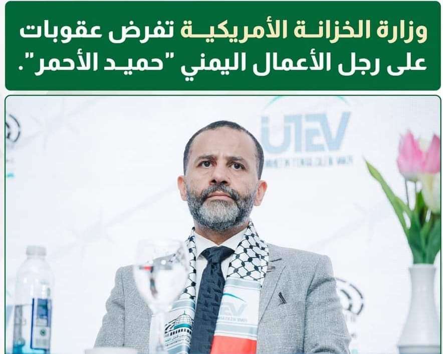 فرضت وزارة الخزانة الأمريكية عقوبات على مجموعة من الشركات التجارية التابعة لرجل الأعمال اليمني، وعضو مجلس النواب "حميد بن عبدالله بن حسين الأحمر"؛ وذلك بدعوى جمع تبرعات خارجية لحركة حمـــ1س الفلسطينية.