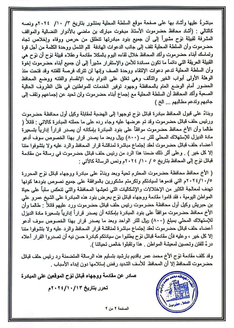 ( الأخ محافظ محافظة حضرموت المحترم تحية وبعد وبناءً على مبادرة ووجهاء قبائل نوَح المحررة 5/10/2024م التي قدموها لسيادتكم وتكرمتم مشكورين بالموافقة على جميع نصوص بنودها كونها تهدف لمعالجة الكثير من الإختلالات والإشكاليات التي تعيشها المحافظة والتي تنعكس سلباً على حياة المواطن اليومية ، فقد قاموا مقادمة ووجهاء قبائل نوَح بعرض بنود هذه المبادرة على الشيخ عمرو علي بن حبريش وكيل أول محافظة حضرموت رئيس حلف قبائل حضرموت ورد عليهم قائلاً : طالما وأن الأخ محافظ حضرموت موافقاً على بنود المبادرة بإمكانه أن يصدر قراراً إدارياً بتسعيرة مادة الديزل للإستهلاك المحلي بمبلغ (800) ريال للتر الواحد وبعد ما يصدر قرار بهذا الخصوص سوف أدعو أعضاء حلف قبائل حضرموت لعقد إجتماع مباشرة لمناقشة قرار المحافظ والرد عليه ولا بتشوفوا مننا إلا كل خير ، وعليه فأن مقادمة قبائل نوَح يطلبوا من سيادتكم كبادرة حسن نيه أن تصدروا القرار أعلاه درءً للفتن وتحسين لمعيشة المواطن . هذا وتقبلوا خالص تحياتنا ).