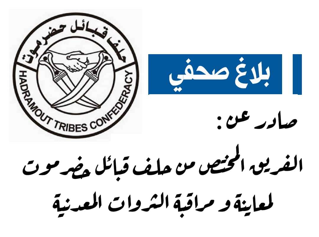 ويجدد حلف قبائل حضرموت حرصه الشديد على عدم السماح بنهب ثروات حضرموت، وان هذه الإجراءات المتخذة هي اجراءات تصب في مصلحة المحافظة ومواطنيها.