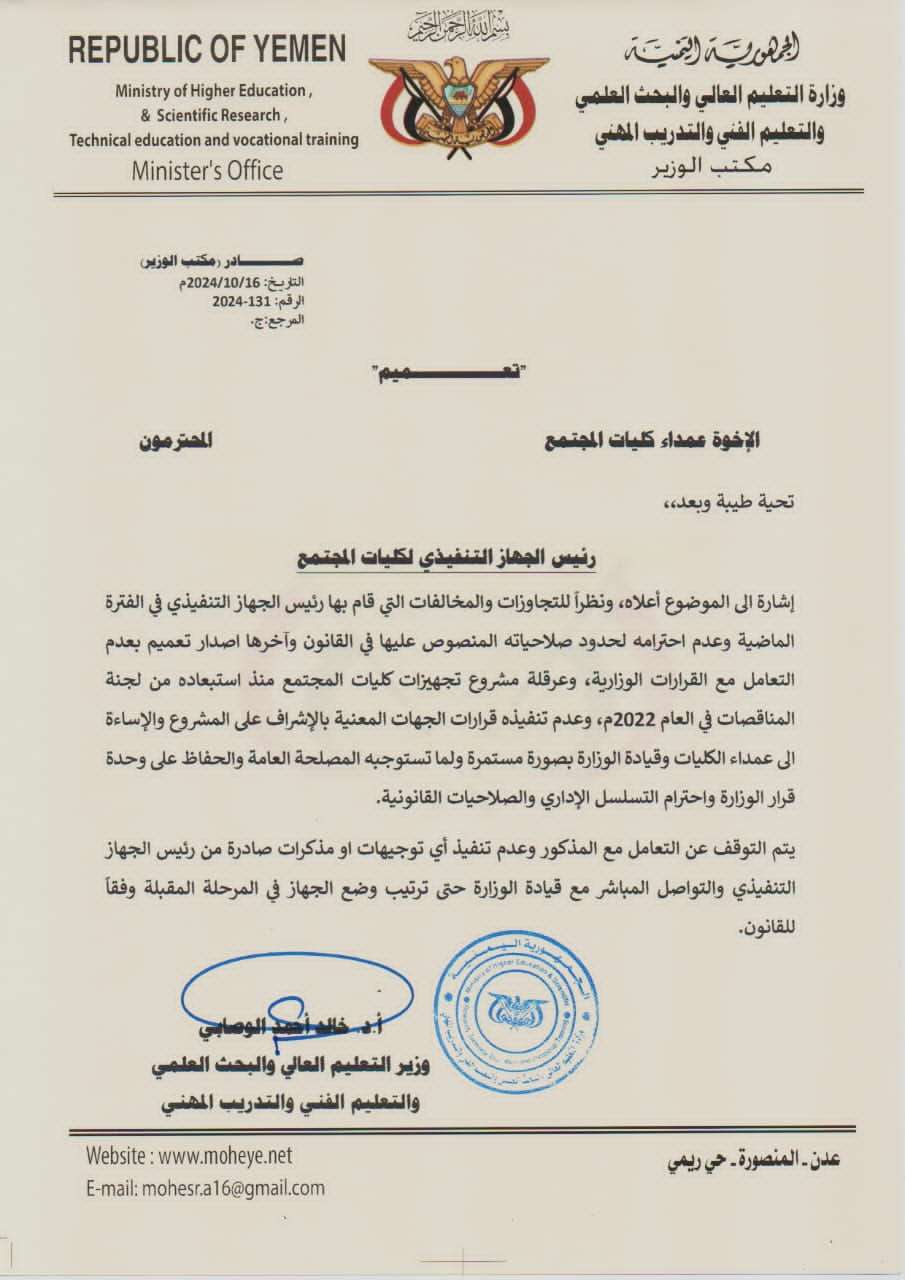 جاء ذلك بمذكرة ارسلها الوزير الوصابي لعمداء كليات المجتمع