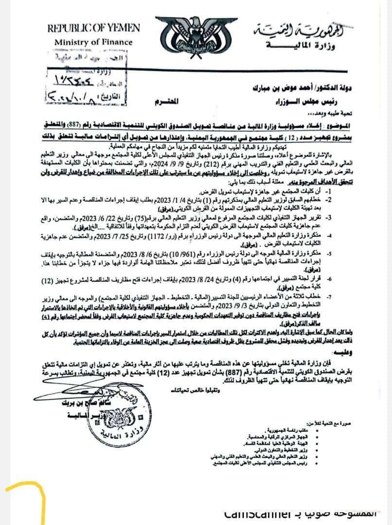 4-قيام وزير التعليم العالي والبحث العلمي والتعليم الفني والتدريب المهني بتوجيه مذكرة إلى وزير المالية مره أخرى برقم 108 بتاريخ 4 سبتمبر 2024م طلب فيها تغيير نموذج التوقيع للجهاز التنفيذي للمجلس الأعلى لكليات المجتمع وإستبعاد رئيس الجهاز التنفيذي للمجلس الأعلى لكليات المجتمع من التوقيع وهذا كله مخالف للقانون باعتبار الجهاز التنفيذي للمجلس الأعلى لكليات المجتمع مستقل ماليا واداريا .