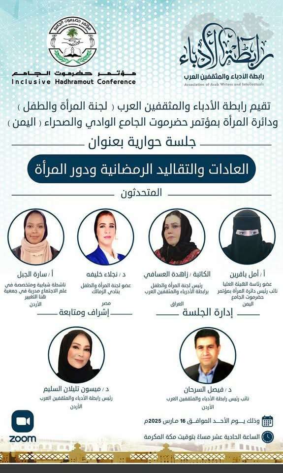 نظمت رابطة الأدباء والمثقفين العرب-لجنة المراة والطفل بالشراكة مع دائرة المراة بمؤتمر حضرموت الجامع الوادي والصحراء مساء امس الاحد الموافق السادس عشر من مارس 2025 م جلسه حواريه ثقافية عن العادات والتقاليد الرمضانية ودور المرأة