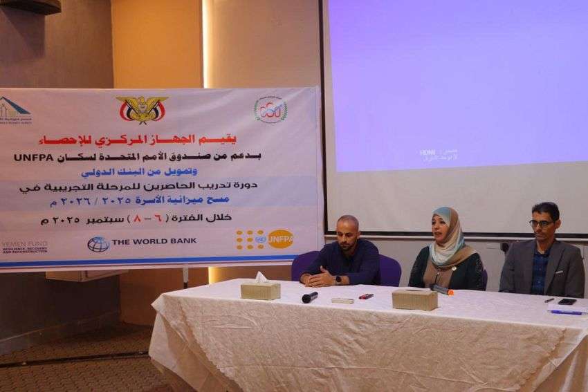 نظّم الجهاز المركزي للإحصاء، بالشراكة مع صندوق الأمم المتحدة للسكان (UNFPA)، اليوم بالعاصمة المؤقتة عدن، دورة تدريب الحاصرين للمرحلة التجريبية في مسح ميزانية الأسرة للعام 2025/2026م، بتمويل من البنك الدولي.