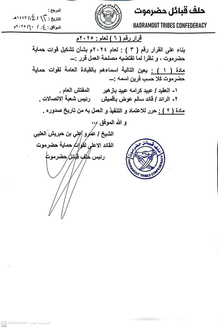 أصدر القائد الأعلى لقوات حماية حضرموت، رئيس حلف قبائل حضرموت، الشيخ عمرو علي بن حبريش العليي، اليوم السبت الموافق 4 أكتوبر 2025م، القرار رقم (6) لعام 2025م، قضت مادته الأولى بتعيين التالية أسماؤهم في القيادة العامة لقوات حماية حضرموت، كلٌّ حسب قرين اسمه:
