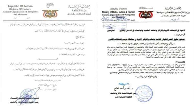 و شدد البيان على أن الهيئة العامة للآثار والمتاحف التابعة للحكومة الشرعية هي الجهة الوحيدة المخولة قانونًا بإصدار التراخيص والنظر في حقوق نشر النقوش والمكتشفات الأثرية في عموم محافظات الجمهورية.
