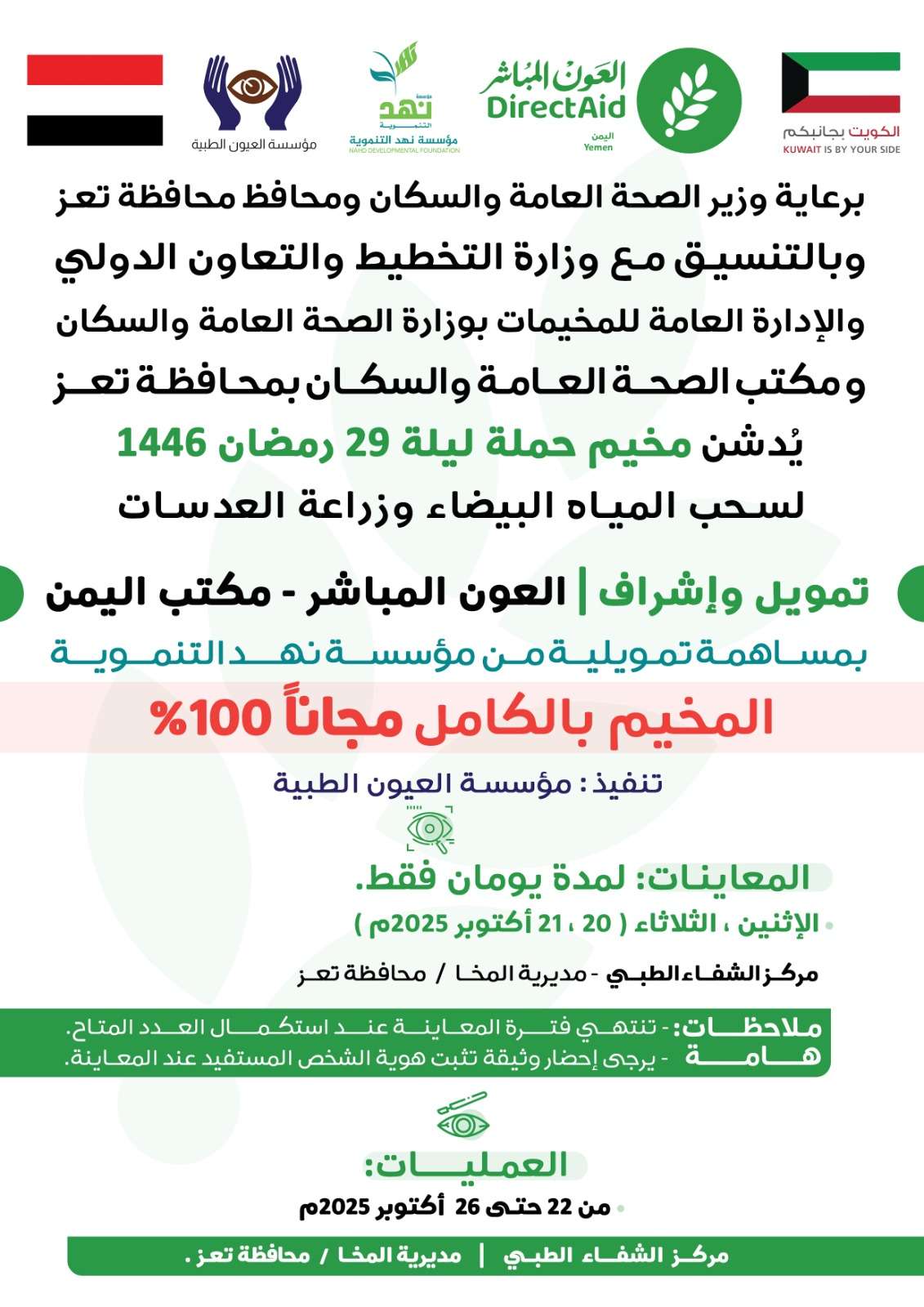 سيقام بمحافظة تعز في مديرية المخاء فعاليات مخيم حملة "ليلة 29 رمضان 1446هـ" لسحب المياه البيضاء وزراعة العدسات مجانًا بنسبة 100%، وذلك برعاية معالي وزير الصحة العامة والسكان ومحافظ محافظة تعز، وبالتنسيق مع وزارة التخطيط والتعاون الدولي، والإدارة العامة للمخيمات بوزارة الصحة العامة والسكان، ومكتب الصحة العامة والسكان بالمحافظة.