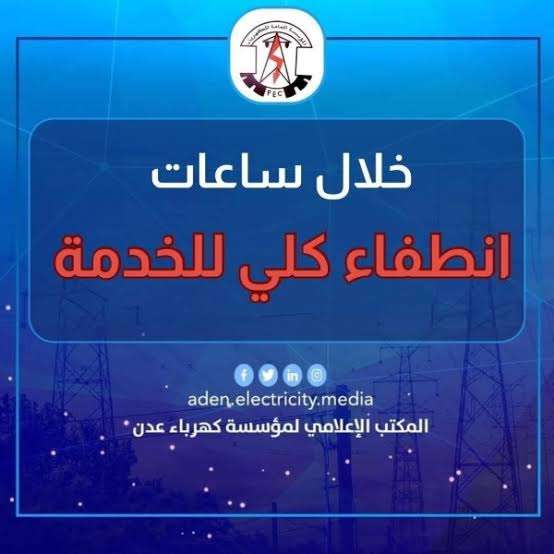 اعلنت المؤسسة العامة للكهرباء – منطقة عدن عن قرب توقف منظومة التوليد بشكل كامل خلال الساعات القادمة، نتيجة استمرار احتجاز ناقلات النفط الخام القادمة من الضبة في منطقة أحور بمحافظة أبين ومنعها من الوصول إلى محطة الرئيس.