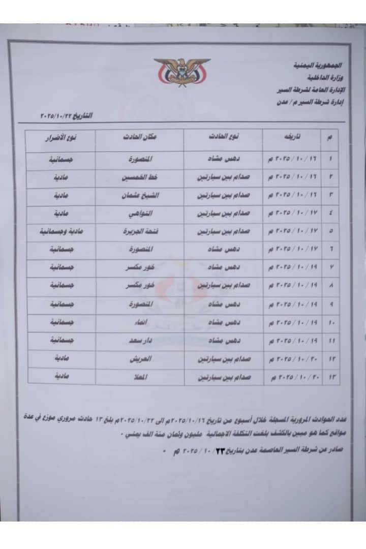 وبحسب التقرير، بلغ إجمالي المخالفات المرورية المسجّلة (1937) مخالفة بمختلف أنواعها، فيما تم تسجيل (13) حادثًا مروريًا نتج عنها عدد من الإصابات تراوحت بين المتوسطة والطفيفة، إلى جانب خسائر مادية قُدّرت بنحو مليون وثمانمائة ألف ريال يمني.