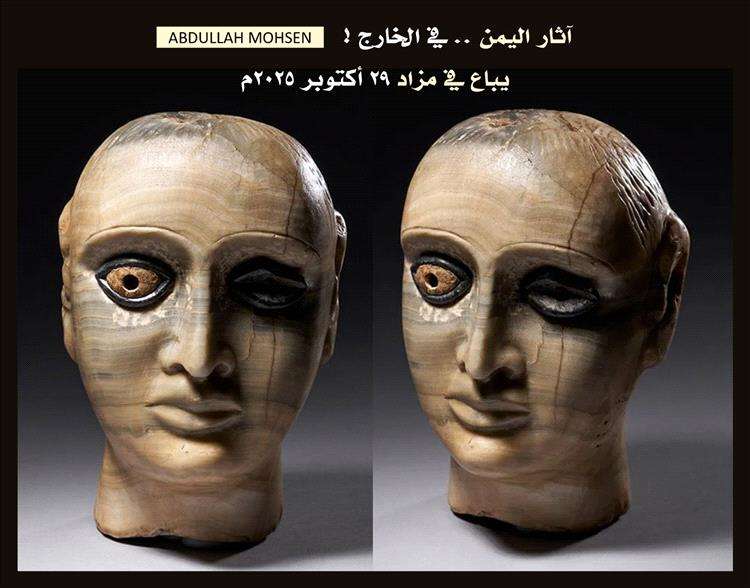 أعلن الخبير عبدالله محسن عن عرض رأس تمثال جنائزي من المرمر يعود إلى آثار اليمن في مزاد بلاكاس بالعاصمة البريطانية لندن، والمقرر غدًا الأربعاء 29 أكتوبر 2025.