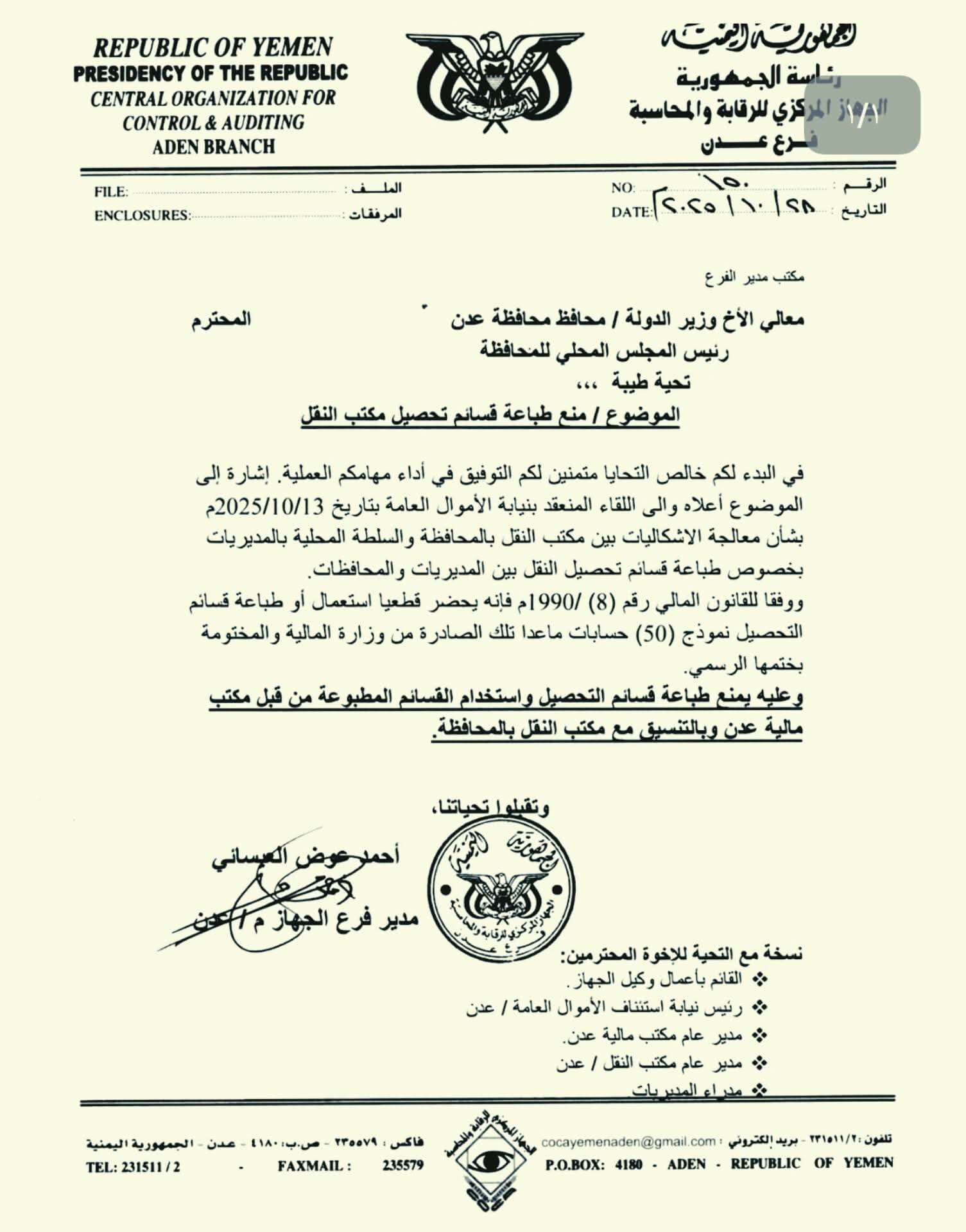 وجه الجهاز المركزي للرقابة والمحاسبة فرع عدن، بمنع طباعة أو استخدام قسائم التحصيل الخاصة بمكتب النقل في المحافظة، إلا تلك الصادرة عن وزارة المالية والمختومة بختمها الرسمي.