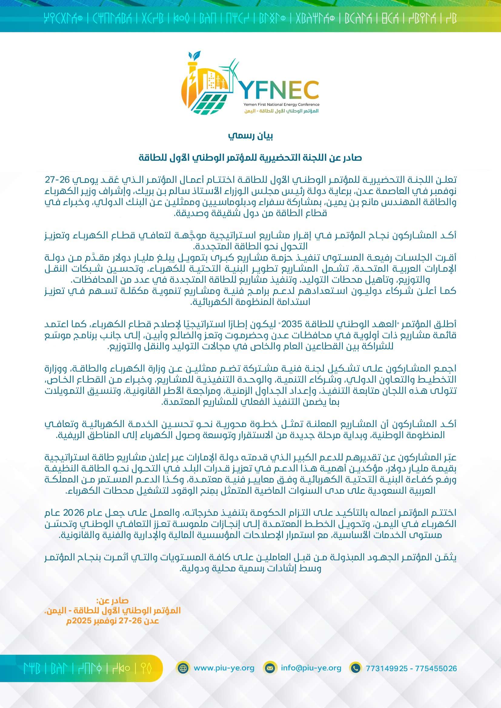 تعلن التحضيرية للمؤتمر الوطني الأول للطاقة اختتام أعمال المؤتمر الذي عُقد يومي 26-27 نوفمبر في العاصمة عدن، برعاية دولة رئيس مجلس الوزراء الأستاذ سالم بن بريك، وإشراف وزير الكهرباء والطاقة المهندس مانع بن يمين، بمشاركة سفراء ودبلوماسيين وممثلين عن البنك الدولي، وخبراء في قطاع الطاقة من دول شقيقة وصديقة.