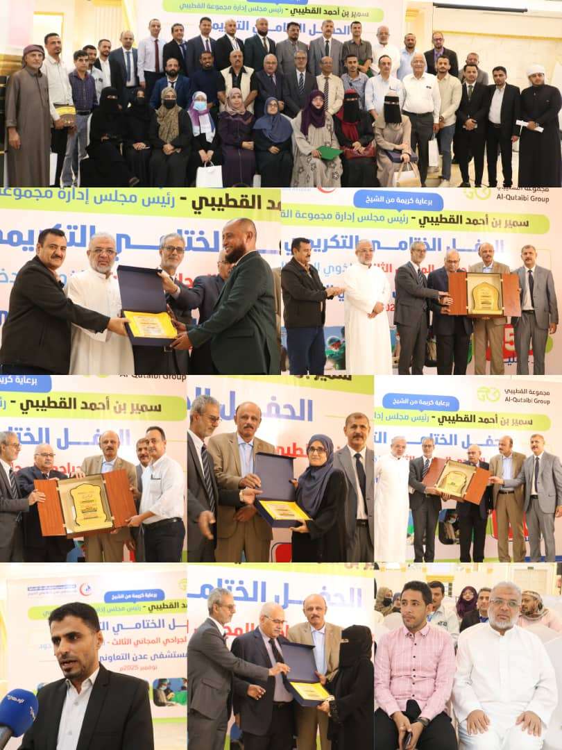 برعاية كريمة من الشيخ سمير بن أحمد القطيبي - رئيس مجلس إدارة مجموعة القطيبي أقيم اليوم في العاصمة عدن الحفل الختامي التكريمي باختتام اعمال المخيم الطبي الجراحي المجاني الثالث - لذوي الدخل المحدود الذي أقيم في مستشفى عدن التعاوني الخيري، و قد تم انجاز حوالي 450 عملية جراحية .
