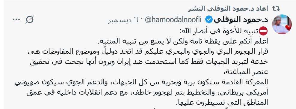 وكتب الدكتور حمود النوفلي، الأستاذ المشارك في جامعة السلطان قابوس، في منشور على منصة “إكس”، أن المرحلة المقبلة قد تشهد تصعيداً واسعاً من عدة جبهات، بدعم جوي تقوده الولايات المتحدة وبريطانيا وإسرائيل، على حد قوله.