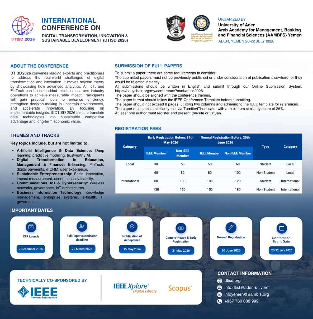 انطلاقاً من رؤية الأكاديمية العربية للعلوم الإدارية والمالية والمصرفية، وجامعة عدن، في تعزيز البحث العلمي ودعم الابتكار، وتماشياً مع التطورات المتسارعة في مجالات التحول الرقمي والابتكار والتنمية المستدامة، يسرنا في اللجنة التحضيرية أن نعلن عن فتح باب استقبال الأوراق العلمية للمؤتمر الدولي الأول للتحول الرقمي والابتكار والتنمية المستدامة DTISD2026