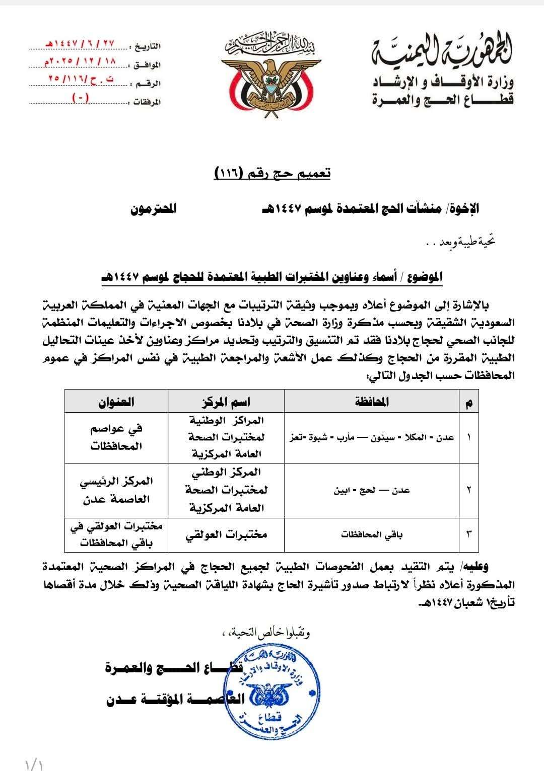 وأوضح التعميم أن اعتماد المختبرات جاء استناداً إلى مذكرة وزارة الصحة والتعليمات المنظمة للجوانب الصحية الخاصة بالحجاج، حيث تم تحديد مراكز بعينها لإجراء الفحوصات الطبية، وأخذ عينات التحاليل، إضافة إلى خدمات الأشعة والمراجعة الطبية. وتشمل هذه المراكز المختبرات الوطنية للصحة العامة (المراكز المركزية) في عواصم المحافظات، والمركز الرئيسي في العاصمة المؤقتة عدن، إلى جانب مختبرات العولقي في بقية المحافظات.