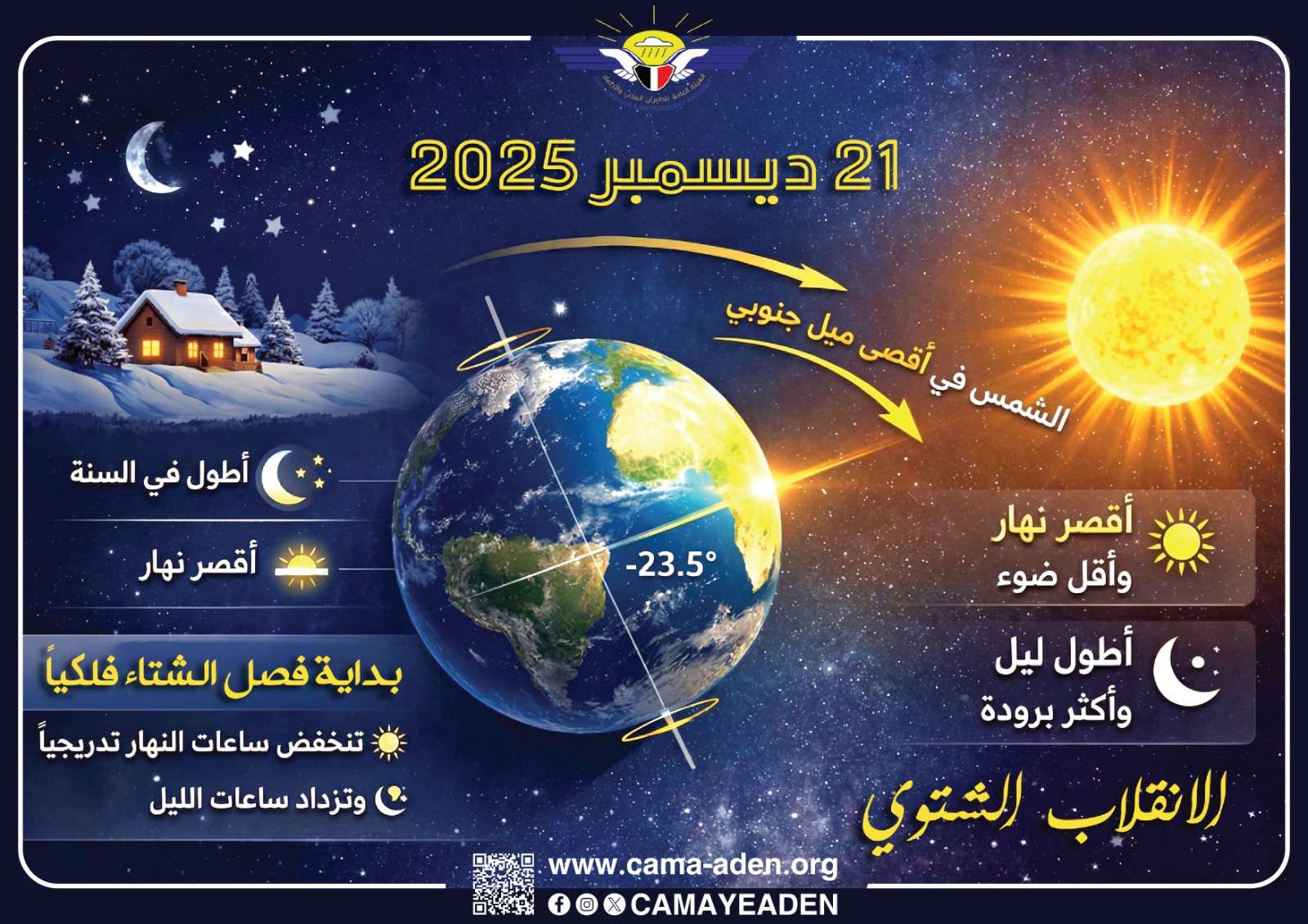 أفاد مركز التنبؤات الجوية والانذار المبكر، التابع للهيئة العامة للطيران المدني والأرصاد بالعاصمة عدن، أن اليوم الأحد 21 ديسمبر 2025، تشهد الكرة الأرضية في نصفها الشمالي ظاهرة الانقلاب الشتوي، التي تمثل بداية فصل الشتاء فلكيًا، ويصادف هذا اليوم أقصر نهار وأطول ليل خلال العام.
