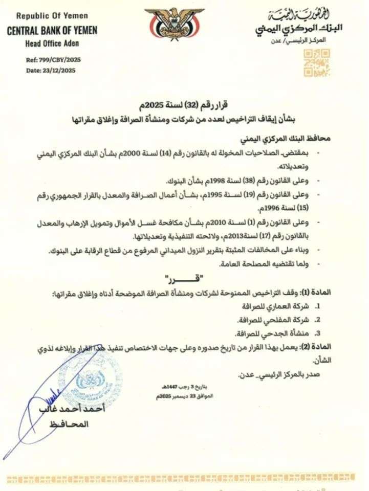 أصدر محافظ البنك المركزي، الأستاذ أحمد أحمد غالب، القرار رقم (32) لعام 2025م، بشأن إيقاف التراخيص الممنوحة لعددٍ من شركات ومنشآت الصرافة المخالفة، وإغلاق مقراتها، وذلك استنادًا إلى تقرير النزول الميداني المرفوع من قطاع الرقابة على البنوك.
