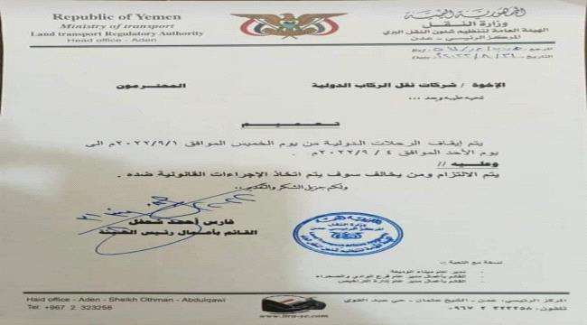 اصدرت الهيئة العامة لتنظيم شؤون النقل البري تعميما بشأن ايقاف الرحلات الدولية عبر منفذ الوديعة.
