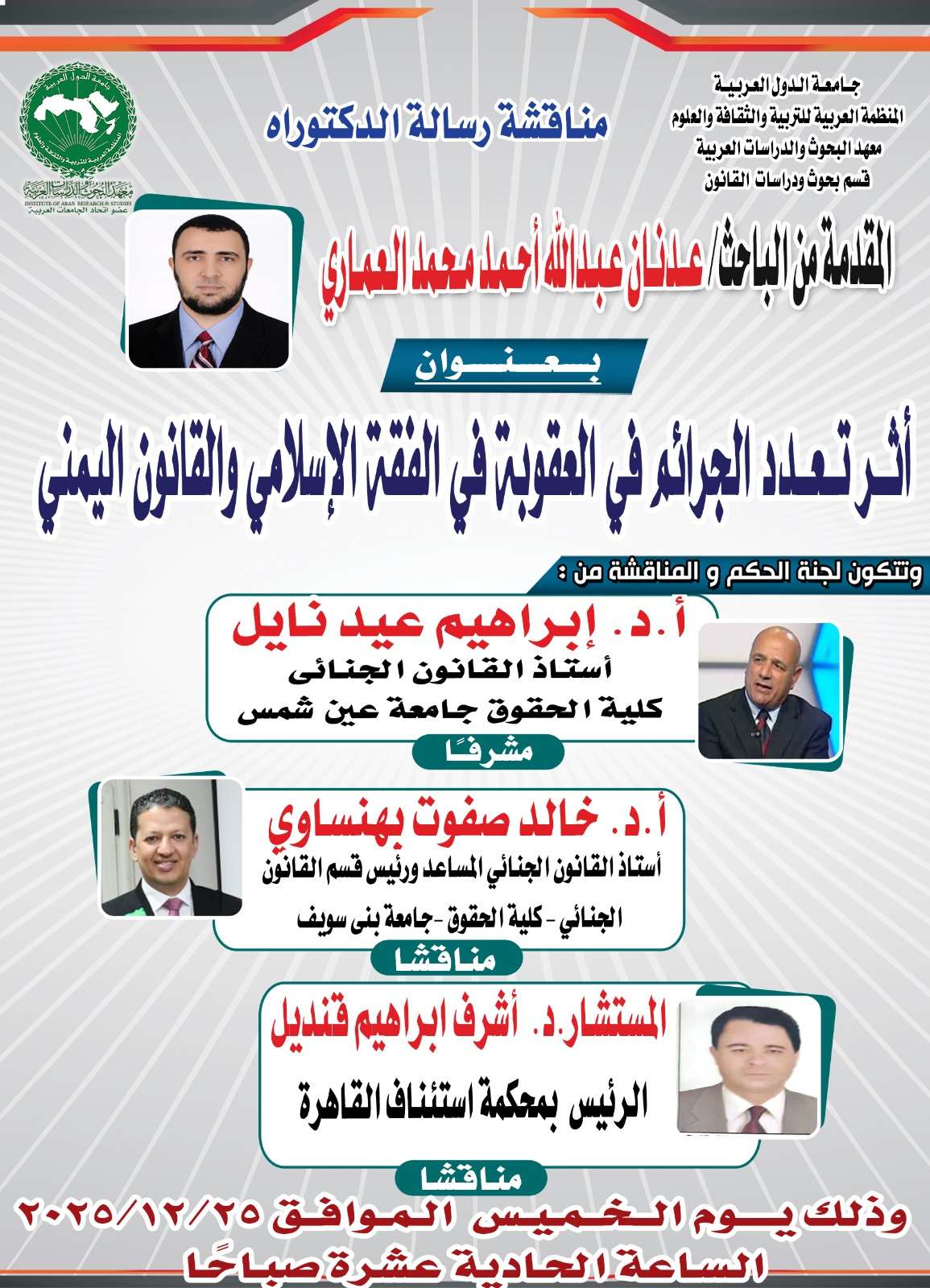 نال الباحث عدنان عبدالله أحمد العماري، اليوم الخميس، درجة الدكتوراه في القانون بامتياز من قسم بحوث ودراسات القانون بمعهد البحوث والدراسات العربية التابع لجامعة الدول العربية، في جمهورية مصر العربية.
