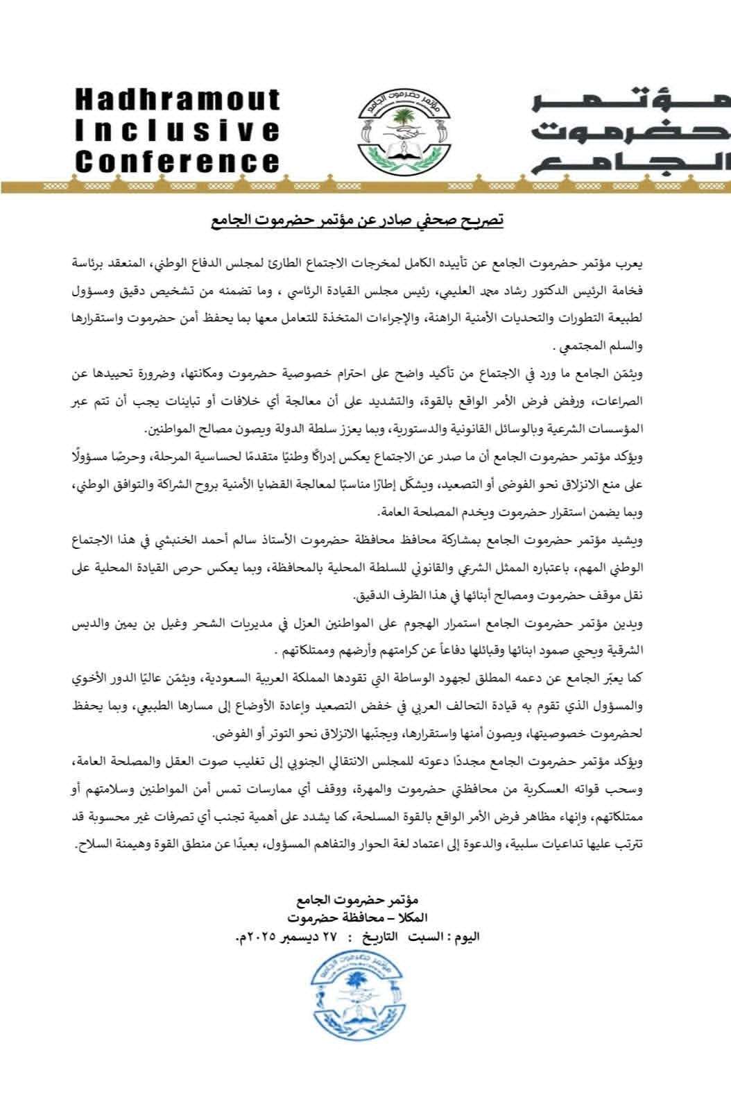 وأعرب البيان عن دعم مؤتمر حضرموت الجامع لجهود الوساطة التي تقودها المملكة العربية السعودية، مثمّنًا دور قيادة التحالف العربي في خفض التوتر وإعادة الأوضاع إلى مسارها الطبيعي، وبما يحافظ على خصوصية حضرموت ويصون أمنها واستقرارها.