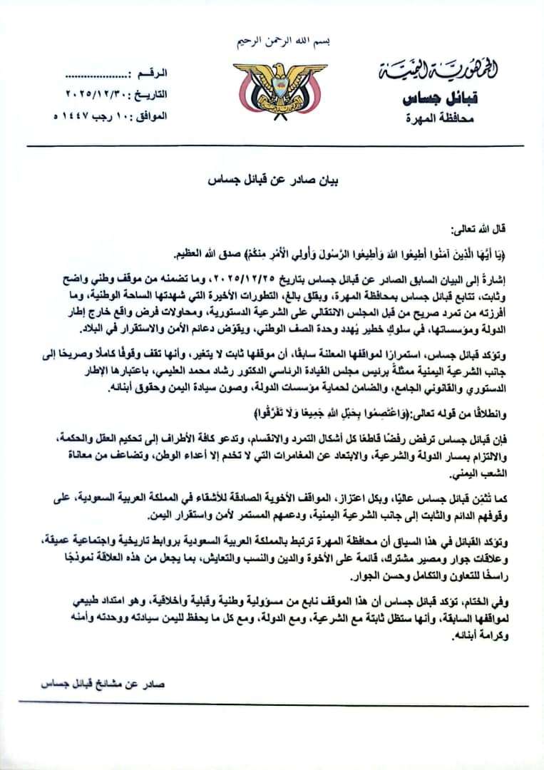 أصدرت قبائل جساس بمحافظة المهرة بيانًا أكدت فيه موقفها الوطني الثابت والداعم للشرعية الدستورية، ممثلةً بمجلس القيادة الرئاسي برئاسة الدكتور رشاد محمد العليمي، مشددة على تمسكها بخيار الدولة ورفضها القاطع لأي محاولات تصعيد أو فوضى من شأنها تهديد وحدة الصف الوطني وزعزعة الأمن والاستقرار.