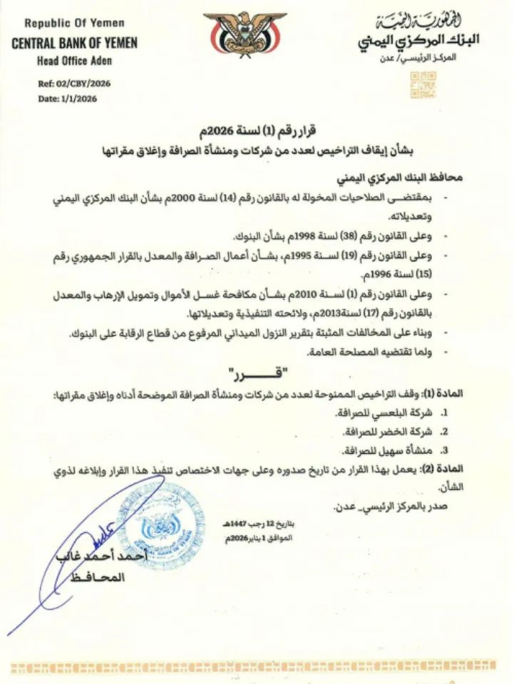 ونص القرار رقم (1) لعام 2026م إيقاف التراخيص الممنوحة لعدد من شركات ومنشآت الصرافة المخالفة، وإغلاق مقراتها، استنادًا إلى نتائج تقارير النزول الميداني الصادرة عن قطاع الرقابة على البنوك.