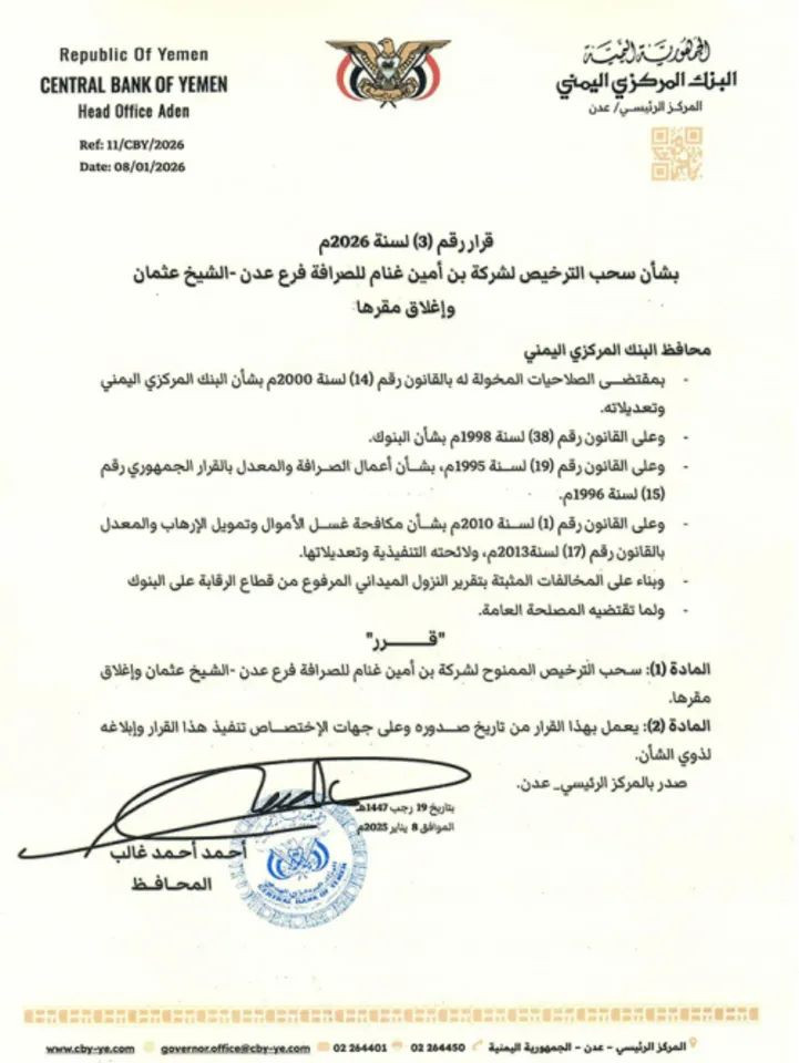 وقضى القرار رقم (3) لعام 2026م، على سحب ترخيص فرع شركة بن أمين غنام للصرافة، على خلفية مخالفات مثبتة في تقرير النزول الميداني المرفوع من قطاع الرقابة على البنوك.